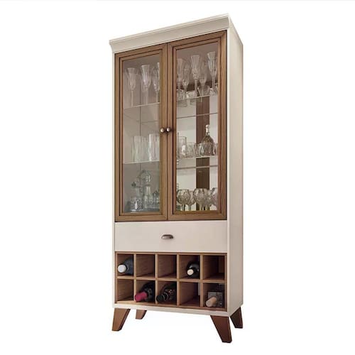 ESPECIFICAÇÕES: Produto em MDP e MDF de 25mm e 15mm Pintura UV 2 Prateleiras de vidro 6mm com suportes cromados Espelho atrás da prateleira de vidro de 3 mm 2 Portas de vidro emolduradas em MDF revestidas com papel melamínico Puxador com acabamento metálico na cor bronze Moldura superior robusta valorizando e realçando os aspectos retrô do móvel Pés de madeira maciça levemente angulados com acabamento envernizado Adega central para 10 garrafas
