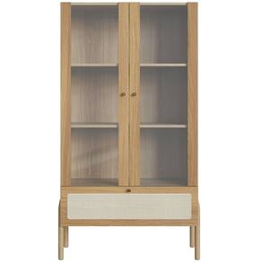 A robustez da estrutura e dos pés em madeira maciça contrastam com a delicadeza das portas de vidro e com o aplique de telinha sintética na gaveta, dando origem a uma cristaleira com traço artesanal, suave e convidativo. Seja para compor a sala de jantar ou até mesmo a sala de estar ou área gourmet, essa cristaleira multifuncional tanto servirá de apoio no momento das refeições, como garantirá organização e fácil acesso.