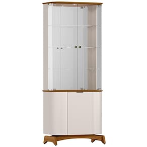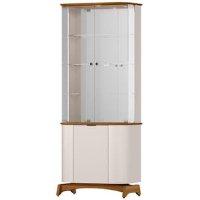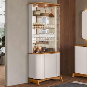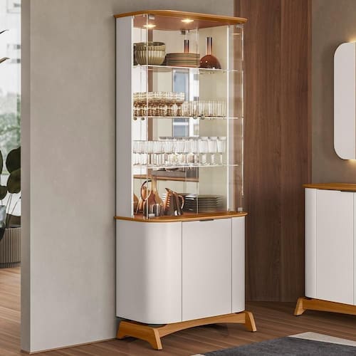 Com prateleiras e duas portas de vidro, essa cristaleira curva transforma a exibição das suas louças e utensílios em uma verdadeira vitrine de beleza. O design orgânico, cuidadosamente elaborado não apenas ressalta a elegância dos itens armazenados, como também agrega funcionalidade ao ambiente. A combinação do acabamento em MDF com os detalhes em vidro cria um visual leve e moderno, ao passo que o fundo com espelhos aplicados adiciona profundidade e um toque a mais de elegância.