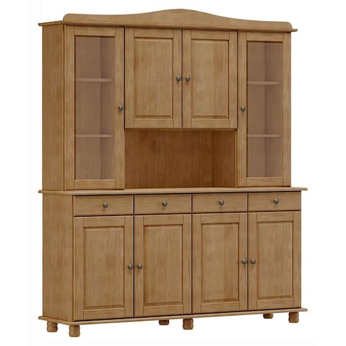 ESPECIFICAÇÕES: Estrutura em madeira maciça de pinus de reflorestamento Pintura acetinada verniz PU e UV 8 Portas Dobradiças com amortecimento Vidro liso incolor em 2 portas superiores laterais Prateleiras em madeira maciça (Peso suportado 10kg distribuídos) 4 Gavetas (Peso suportado 5kg distribuídos) Corrediças telescópicas Puxadores metálicos em ouro envelhecido Pés torneados em madeira maciça