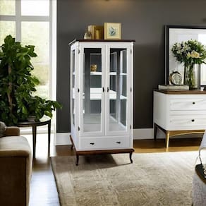 - 01 Cristaleira de Madeira 2 Portas 1 Gaveta 2 Prateleiras Lateral com Vidro Fundo com Espelho Pés Luiz XV