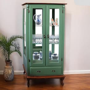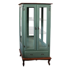 - 01 Cristaleira de Madeira 2 Portas 1 Gaveta 2 Prateleiras Lateral com Vidro Fundo com Espelho Pés Luiz XV