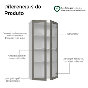 O acabamento fosco de alta resistência da estrutura é em Branco e das portas em Cinza, refletindo o estilo americano com um toque moderno. Possui uma textura suave ao toque, trazendo leveza e sofisticação ao ambiente. O destaque vai para os puxadores ponto em ouro envelhecido, feitos com metal resistente, que adicionam personalidade e um charme único.