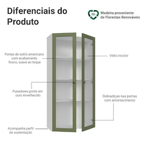 O acabamento fosco de alta resistência da estrutura é em Branco e das portas em Verde, refletindo o estilo americano com um toque moderno. Possui uma textura suave ao toque, trazendo leveza e sofisticação ao ambiente. O destaque vai para os puxadores ponto em ouro envelhecido, feitos com metal resistente, que adicionam personalidade e um charme único.