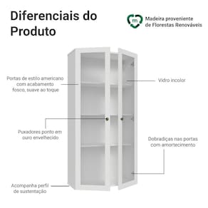 O acabamento fosco de alta resistência da estrutura e das portas é em branco, refletindo o estilo americano com um toque moderno. Possui uma textura suave ao toque, trazendo leveza e sofisticação ao ambiente. O destaque vai para os puxadores ponto em ouro envelhecido, feitos com metal resistente, que adicionam personalidade e um charme único.