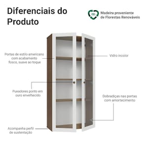 O acabamento fosco de alta resistência da estrutura é em amadeirado Rustic e das portas em Branco, refletindo o estilo americano com um toque moderno. Possui uma textura suave ao toque, trazendo leveza e sofisticação ao ambiente. O destaque vai para os puxadores ponto em ouro envelhecido, feitos com metal resistente, que adicionam personalidade e um charme único.