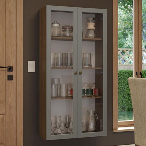 Esta versão foi projetada para instalação suspensa na parede, acompanhando um kit de fixação, que possibilita ajustar a altura da cristaleira conforme sua preferência, garantindo praticidade e otimização do espaço.