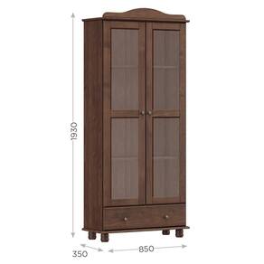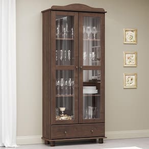 A Cristaleira Vitrine Rubi da Finestra Móveis combina charme clássico e qualidade superior em um único móvel. Com estrutura em madeira maciça de pinus de reflorestamento e acabamento acetinado com verniz PU e UV, oferece durabilidade e um visual elegante. Conta com 2 portas com vidro liso incolor, que permitem a exposição refinada de itens decorativos ou louças. Internamente, possui prateleiras em madeira maciça com capacidade de até 10 kg distribuídos. A gaveta inferior, com frente em madeira e corrediças telescópicas, suporta até 5 kg e é ideal para armazenar pequenos objetos. Os puxadores metálicos em ouro envelhecido e os pés torneados em madeira maciça completam o estilo tradicional e sofisticado da peça.
