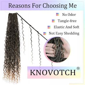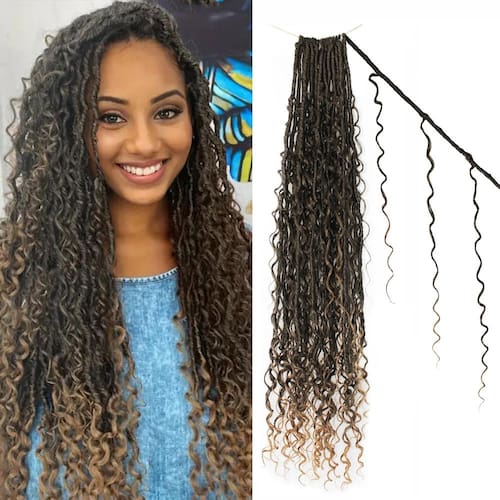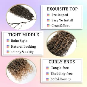 Boho Faux Locs Crochet Hair: Goddess Locs Crochet Hair com pontas encaracoladas como cabelo humano - Pacote: 8 pacotes por lote, 10 fios por pacote, 3 cachos como cabelo humano por fio. Normalmente, 7 pacotes são suficientes para uma cabeça inteira. - Características: cada fio de cabelo de crochê Goddess Locs apresenta três cachos como cabelo humano para um visual completo, natural e bonito. Cada Boho Faux Loc é pré-enrolado para facilitar a instalação de crochê. - Material: Tecnologia de fibra química atualizada, crochê Boho Goddess Locs com o toque encaracolado macio como cabelo humano. Sem cheiro, sem emaranhados, sem queda, textura macia, hipoalergênico. - Garantia: Nosso cabelo de crochê macio Goddess Locs oferece uma melhor experiência. Se você não estiver completamente satisfeito com nossos falsos Locs Bohemian River, para obter ajuda. - Estilo: Goddess Bohemian Locs Crochet Hair apresenta cachos profundos, deixando seu cabelo mais cheio. Com várias atualizações, é mais leve, mais amigo da pele e mais natural. Seja para um dia da semana, encontro, casamento, Natal, Halloween ou outras ocasiões especiais, você será o centro das atenções!
