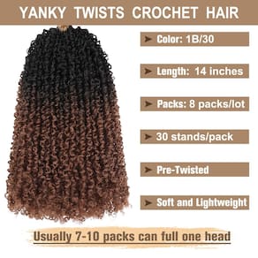 -?Cabelo de crochê Yanky Twist pré-torcido de 14 polegadas?Prepare-se para mostrar seu charme com nossa linda Yanky Twists Braiding Hair Curly Ends! Nosso novo estilo de tranças de crochê Bohemian Yanky Twists são pré-torcidas, com pequenos cachos muito naturais nas pontas, muito fofas. 8 pacotes/lote, 30 fios/pacote, total de 240 fios, geralmente 7 a 10 pacotes podem encher uma cabeça. Há muitas cores para escolher para combinar com seu estilo!