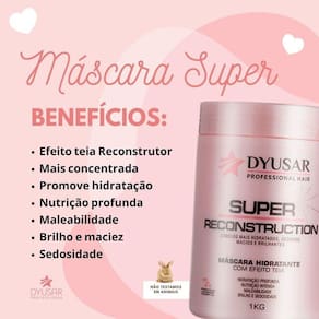 Máscara hidratante super reconstruction 1kg dyusar a mascara hidratante é uma máscara capilar que tem efeito teia, promove hidratação profunda, nutrição intensa, maleabilidade, brilho e sedosidade. modo de usar: apos lavar os cabelos, aplique o produto sobre toda a extensão dos fios. Massageie e deixe agir por aproximadamente 7 minutos. enxágue bem.