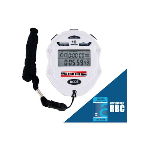 CRONÔMETRO DIGITAL COM 99 LAP E SPLIT, 10 MEMÓRIAS, RELÓGIO, CALENDÁRIO, ALARME, TEMPORIZADOR, CONTADOR MANUAL PROGRESSIVO E REGRESSIVO MODELO CD-3000 COM CERTIFICADO DE CALIBRAÇÃO DESCRIÇÃO: Cronômetro digital modelo CD-3000 possui display duplo de 6 dígitos, pesando 24,5g realiza contagem manual progressiva e regressiva, relógio com calendário, alarme programável, contagens para 99 LAPS e 99 SPLIT com resolução de 1/100, temporizador com alarme e memória para armazenar 10 contagens. DESTAQUES: Display com 6 dígitos de cristal líquido, resolução de 1/100, contagem manual progressiva e regressiva, alarme, calendário, relógio, memória para 10 contagens. APLICAÇÕES: O cronômetro digital CD-3000 é utilizado para medir pequenos intervalos de tempo, geralmente até centésimos de segundos, amplamente utilizado na industria, laboratório, cozinha, práticas esportívas e etc. DESCRIÇÃO CERTIFICADO CALIBRAÇÃO: Certificado de calibração RBC p/ cronômetro faixa de 0 a 9000 seg sob proc. 073 em 2 pontos distribuídos conforme escopo. ESPECIFICAÇÕES TÉCNICAS: Display de cristal líquido com 6 dígitos Relógio eletrônico Escala do cronômetro: “23H59´59” Resolução 1/100 seg < 30 minutos Botão seletor de funções Cronômetro Alarme Ajuste data/Hora LAP Memória para 99 LAPS SPLIT Seleção de formato 12/24 Temperatura de Operação: 0 a 50°C Umidade de Operação: 30 a 80 % UR Alimentação: Bateria 1.5 v Peso: 24,5 g Dimensões(C x L x A): 78x65x18mm ACESSÓRIOS FORNECIDOS: Cronômetro digital CD-3000 Bateria 1.5 v Manual de instruções Certificado de calibração RBC