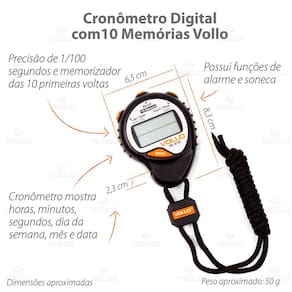 O Cronômetro Digital Profissional com 10 Memórias Vollo é completo, possui hora, data, alarme, precisão de 1/100 segundos e memorizador das 10 primeiras voltas.