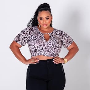 ESPECIFICAÇÕES DO MODELO: -Cropped com estampa oncinha -Modelo plus size -Com decote V -Com mangas curtas e detalhe franzido -Confortável -Flexível -Perfeita para compor várias opções de looks