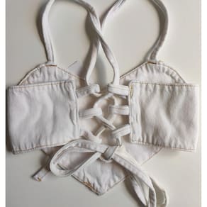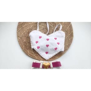 Cropped jeans bordado com alças tamanho ajustável nas costas.