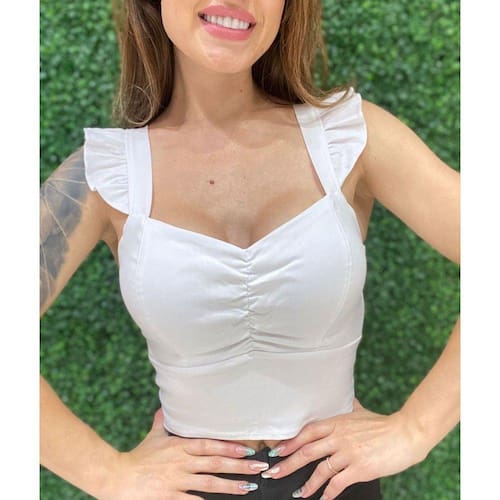 Cropped Slim Babado na Alça e Franzido na Frente Branco