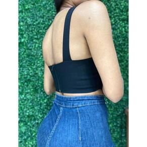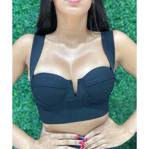 Detalhe: Cropped Com Abertura em V e Alças Laterais com Bojo e Zíper atrás.