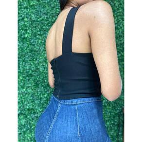 Detalhe: Cropped com Ombro Ùnico, Decote Cruzado Tiras Laterais Cruzadas Com Bojo e Ziper