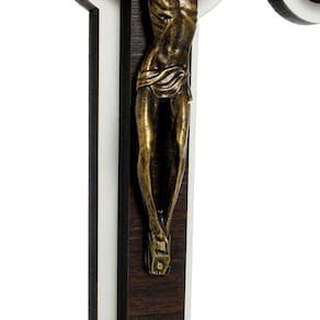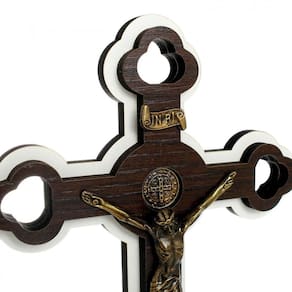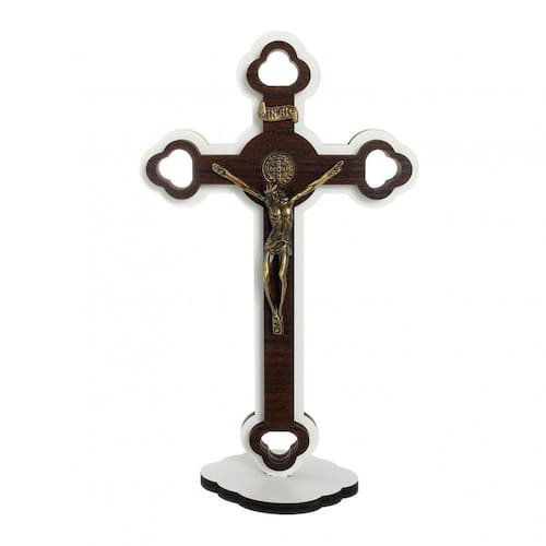 Crucifixo de mesa em madeira MDF, nas cores branco e tabaco com Cristo e medalha de São Bento em metal ouro velho, borda trabalhada.