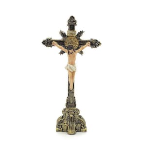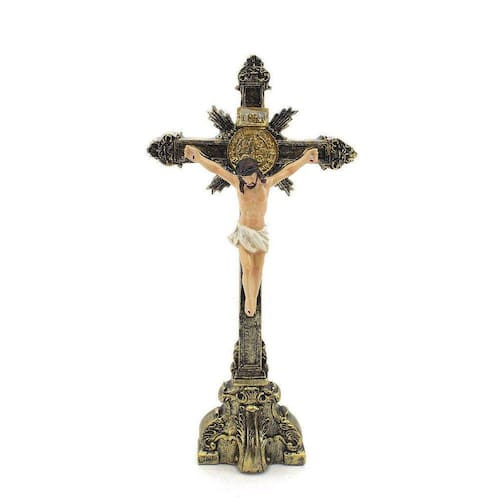 Crucifixo Pedestal Importado Resina 20 cm A Cruz simboloza a glorificação de Cristo, um sinal de entrega de amor que possibilitou a nossa salvação. Dimensões: altura: 9 cm - Largura: 4 cm - Profundidade: 3 cm Dimensões aproximadas do produto. Produto pintado a mão, podendo sofrer variações de cores. Marca: Amém Decoração Religiosa
