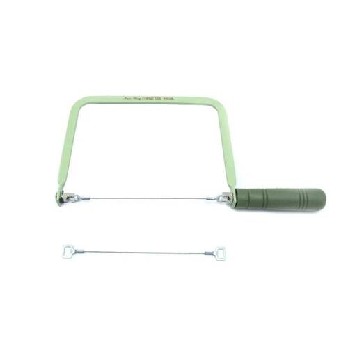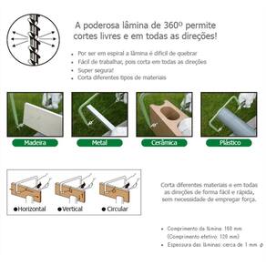 Este serrote com lâmina de 360º espiral em metal mole é muito versátil, cortando em todas as direções, permitindo cortes livres, mesmo em curva ou circulo. A lâmina em formato espiral é mais segura devido a projeção de seu fio. Pode ser Utilizado para cortar diversos materiais como madeira, plastico, metais e cerâmica sem verniz . Características do produto: Comprimento total: 285mm Largura total: 145mm Comprimento arco: 136mm Comprimento lâmina: 120mm Espessura Lâmina: 1,05mm Peso: 260gr do Japão.