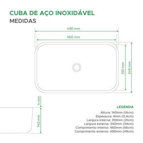 - Material: Aço Inoxidável - Dimensões: 490mm comprimento x 340mm largura x 4mm espessura x 140mm profundidade - Acabamento: Brilhante - Tipo de Instalação: Embutir ou Sobrepor - Formato: Retangular Características: - Resistência à Corrosão: garantindo alta resistência à corrosão e durabilidade. - Versatilidade: Pode ser instalada de diferentes formas embutida ou sobreposta , adaptando-se a diversos estilos de cozinha. - Design Moderno: Formato retangular com cantos arredondados, proporcionando um visual sofisticado e moderno. Marca: Não Informado