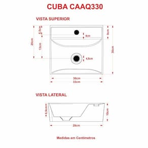 - Cor: Colorida- Marca: Compace- Modelo: CDQD330- Linha: Conect- Formato: Angular Quadrada- Tipo de Cuba: Apoio- Material: Mármore Sintético- Acabamento: Hard Lacca PU- Escala de Brilho: Brilho- Possui Ladrão: Não- Possui Furação para Torneira: Sim- Diâmetro do Furo para Torneira: (32mm) - DN 32- Diâmetro do Furo para Válvula: (40mm) - DN 40- Comprimento: 33cm- Largura: 30cm- Altura: 10cm- Peso Líq.: 4,6Kg- Recomendações de Uso, Manutenção e Limpeza: Utilize flanela seca ou pano macio, levemente umedecido com água. Evite contato com produtos químicos e abrasivos (solventes, thinner, acetona etc) e não utilize nenhum tipo de esponja de aço. Para maior brilho, recomendamos a utilização de cera automotiva n 2.- Necessita de Montagem: Sim / Acompanha Manual de Montagem-Complexidade da Montagem: Média: pode ser montado por mais de uma pessoa e/ou necessite de maior conhecimento para montagem.-Garantia: 6 meses