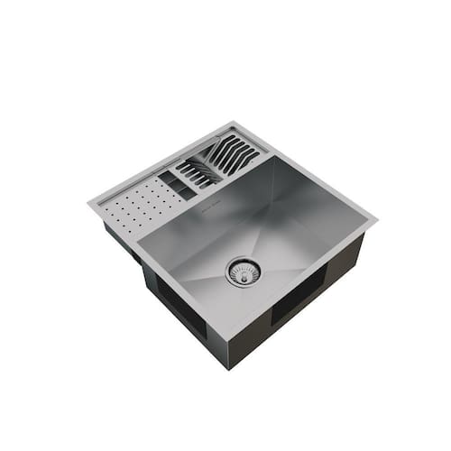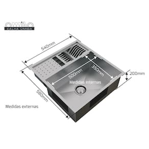 Material: Aço Inoxidável AISI 304 Espessura: 1 mm Acabamento: Scotch Brite Instalação: Embutir ou sobrepor. Medidas externas da cuba: 580 x 540mm (Comp x Larg) Medidas internas da cuba: 500 x 350mm (Comp x Larg) Profundidade da cuba: 200mm