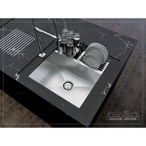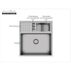 Cuba com Calha Úmida completa integrada; Acompanha válvula de inox 4.1/2". Possibilidade de instalar triturador na mesma furação da válvula; Cuba ampla e versátil; Calha Úmida completa com 3 módulos; Possui Anti ruído (aplicação de PAD especial na parte inferior e lateral externa da cuba, essa aplicação reduz o som causado pelo contato da água na cuba).