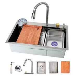 Itens Inclusos: -1 Cuba Gourmet Cascata em Aço inox 304; -1Torneira Misturador Monocomando com Cascata e Spray; -1 Lavador Integrado; -1 Tábua de corte -1 Válvula de 4 1/2" (Possibilita a instalação de Triturador de Resíduos); -1 Dispenser de detergente de 300 ml com sistema recarrega fácil; -2 Cestos escorredores; -1 Sifão