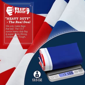 A bandeira com tecnologia Anley Rip-Proof pesa 13,5 onças, com escurecimento total, sem transparência e, portanto, com uma cor mais viva e brilhante.