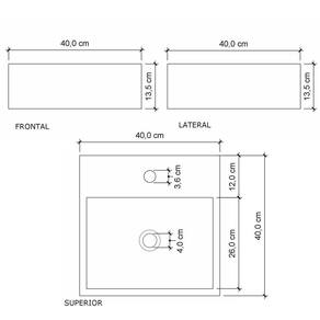 Características Gerais do Produto: - Altura: 16 cm - Garantia: Garantia de fábrica 3 meses - Largura: 40 cm - Marca: Venturi - Material da Cuba: Cuba em Pedra Ardósia com Pintura PU - Montagem Necessária?: Sim - Peso: 17 kg - Profundidade: 40 cm - Tipo de Instalação: De Sobrepor