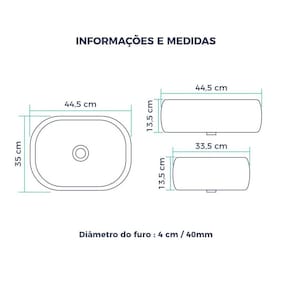 Contém: 01 cuba de apoio oval Marca: mondialle Tamanho: 445 x 350 x 135mm Cor: branca Formato: oval Tipo: cuba de apoio Material: cerâmica Diâmetro furo : 40mm / 4 cm Peso: 7,9kg
