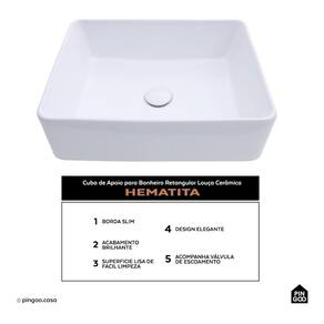 A Cuba de Apoio para Banheiro Retangular Louça Cerâmica Hematita da Pingoo.casa oferece sofisticação e praticidade para o seu banheiro ou lavabo. Com um design retangular em louça cerâmica, ela se adapta a diferentes estilos de decoração, trazendo um toque contemporâneo e elegante ao ambiente.