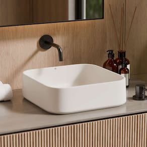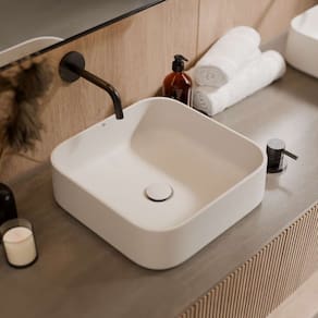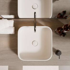 Tipo: Cuba de Apoio Quadrada para Banheiro Material: Superfície Sólida Mineral Cor: Branco Acabamento: Fosco Medidas: 38 x 38 x 11,5 cm Instalação: Apoio sobre bancada Diferenciais: Material não poroso, fácil de limpar, resistente a manchas e abrasões Estilo: Minimalista, sofisticado e atemporal