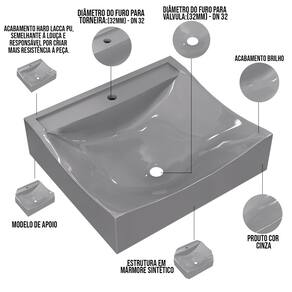 Estrutura em Mármore Sintético com acabamento Hard Lacca PU, semelhante a louça e responsável por criar mais resistência a peça.