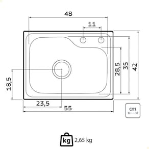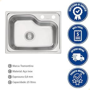 CARACTERÍSTICAS - Instalação: Por baixo. - Cuba: Simples. - Capacidade: 25 L. - Material: Aço Inox AISI 304. - Espessura: 0,8 mm. - Acabamento: Acetinado. - Profundidade da cuba: 19 cm. - Furo para torneira: Sim, 2. -Acessórios inclusos: 1 Válvula 4 e tampão para furo de torneira.