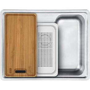 Cuba de Sobrepor Bell BCX 610-61 61x48 com Acessórios Fosco FrankeBCX 610-61 COM ACESSÓRIOS Cuba em aço inox 304 de 0,8mm de espessura com acabamento polido (fosco) Largura 480.00 mmComprimento 610.00 mm Largura cuba 545.00 mm (interno)Comprimento cuba 415.00 mm (interno)Profundidade cuba 200.00 mm Largura do nicho de instalação 456.00 mmComprimento do nicho de instalação 586.00 mm Furo de Válvula 4 1/2" (acompanha válvula)Furo para Torneira: Sim 1 Acessórios inclusos: cesto coador branco, dosador de sabão e tábua de madeira