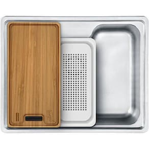 Cuba de Sobrepor Bell BCX 610-61 61x48 com Acessórios Fosco Franke BCX 610-61 COM ACESSÓRIOS Cuba em aço inox 304 de 0,8mm de espessura com acabamento polido fosco Largura 480.00 mm Comprimento 610.00 mm Largura cuba 545.00 mm interno Comprimento cuba 415.00 mm interno Profundidade cuba 200.00 mm Largura do nicho de instalação 456.00 mm Comprimento do nicho de instalação 586.00 mm Furo de Válvula 4 1/2" acompanha válvula Furo para Torneira: Sim 1 Acessórios inclusos: cesto coador branco, dosador de sabão e tábua de madeira
