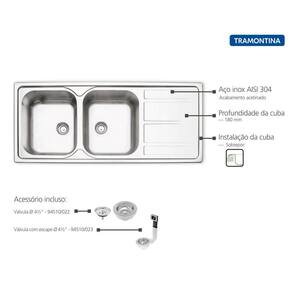 Cuba De Sobrepor Tramontina Marea 2c 34 Plus Em Aço Inox Acetinado 116 X 50 Cm Cozinha ampla e aconchegante é a prioridade de quem gosta de cozinhar e receber amigos. A Cuba de Sobrepor Tramontina Marea com 2 Cubas em Aço Inox com Acabamento Acetinado, 116 x 50 cm com Escorredor e Válvula, da linha Prime, é ideal para compor este ambiente. As cubas possuem válvulas descentralizadas, que facilita a instalação no interior da bancada, além de escorredor com caimento que evita o acúmulo de água.Linha ou Coleção - PrimeComprimento - 116 cmLargura - 50 cmAltura - 18 cmMedida(s) da(s) Cuba(s) (Comp. x Larg.) - 34 x 40 cmNicho de Corte (Comp. x Larg.) - 113,5 x 47,5 cmAcessórios Inclusos - Válvula 4.1/2" com escapeVálvula 4.1/2" Kit de instalaçãoFuro para Torneira - NãoMaterial - Aço Inox 304Capacidade - 20,5 L + 20,5 LEspessura - 0,7 mmAcabamento - AcetinadoCor - InoxAplicação - SobreporInstalação - Por cimaAcompanha válvula - SimPosicionamento da válvula - DescentralizadaFuração da válvula - 4.1/2"Válvula escape/ladrão - SimAceita triturador - SimAcabamento da válvula - Luxo com pino metalMonobloco - NãoAnti-ruído - SimAcompanha Kit de Instalação - SimAmbiente - CozinhasMais Informações - Instalação: SobreporCuba: DuplaCapacidade: 20,5 + 20,5 LMaterial:- Aço Inox AISI 304- Espessura: 0,7 mmAcabamento: AcetinadoProfundidade da cuba: 18 cmFuro para torneira: NãoAcessórios inclusos:- Kit de instalação- 1 Válvula 4 1/2- 1 Válvula 4 1/2 com escapeRecomendações de Uso - Remover a etiqueta colada na pia.Limpar a pia com detergentes normais neutros.Usar somente esponja macia ou pano para lavar a pia.Esta peça contém bordas cortantes. Manusear com cuidado.Não usar ácido muriático, água sanitária ou qualquer outro solvente para lavar objetos na pia.Na reforma ou construção, proteger a pia para não deixar sobre a mesma pó de cimento ou gesso.Marca - TramontinaPeso - 6,00 kgAviso sobre o produto - Imagem Meramente IlustrativaGarantia - 120 meses para vícios ou defeitos de fabricação