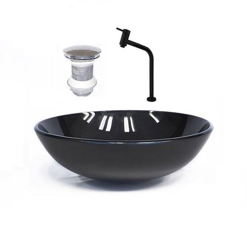 Cuba de vidro redonda 31cm preta + valvula + torneira preta as nossas cubas de vidro são ideais para projetos de decoração em banheiros com alto padrão e bom gosto, pois proporcionam um efeito moderno e único ao ambiente, são instaladas sobre a bancada e por isso realçam com destaque o acabamento do seu banheiro, sem contar a eficiência e praticidade que se leva para a sua casa. O vidro é pintados com tinta de alta performance, o que lhe garante a permanência da cor. Na compra deste super combo 3 em 1, você compra de uma só vez, a cuba redonda, válvula click e a torneira de metal preta, de forma mais fácil, mais rápido e mais barato. Dados técnicos da cuba: formato: redonda; material: vidro; instalação: apoio ou sobrepor; dimensões: 31x31x13cm comprimento x profundidade x altura ; espessura: 12mm. Dados técnicos da válvula: formato: redonda; material: polipropileno; instalação: cubas, tanques e lavatórios; diâmetro: 1. 1/4 polegadas. Dados técnicos da torneira preta: material: liga metálica preta; conexão de entrada: 1/2 polegada -1/4 volta; altura total da torneira: 37 cm; altura da queda dágua: 27 cm. Garantia de todos os itens: 12 meses conforme política de troca e devoluções . Atenção: preço referente a cuba, válvula click e torneira de metal preta. Montagem: montagem e instalação não inclusa na venda ou preço do produto, elas são de inteira responsabilidade do cliente. Imagens ilustrativas.