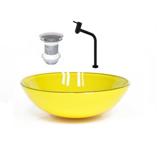 Cuba de vidro redonda 35cm amarela + valvula + torneira preta As nossas cubas de vidro são ideais para projetos de decoração em banheiros com alto padrão e bom gosto, pois proporcionam um efeito moderno e único ao ambiente, são instaladas sobre a bancada e por isso realçam com destaque o acabamento do seu banheiro, sem contar a eficiência e praticidade que se leva para a sua casa. O vidro é pintados com tinta de alta performance, o que lhe garante a permanência da cor . Na compra deste super combo 3 em 1, você compra de uma só vez, a cuba redonda, válvula click e a torneira de metal preta, de forma mais fácil, mais rápido e mais barato. Dados técnicos da cuba: Formato: redonda; Material: vidro; Instalação: apoio ou sobrepor; Dimensões: 35x35x13cm comprimento x profundidade x altura ; Espessura: 12mm. Dados técnicos da válvula: Formato: redonda; Material: polipropileno; Instalação: cubas, tanques e lavatórios; Diâmetro: 1.1/4 polegadas . Dados técnicos da torneira preta: Material: liga metálica preta; Conexão de entrada: 1/2 polegada -1/4 volta; Altura total da torneira: 37 cm; Altura da queda dágua: 27 cm. de todos os itens: 12 meses conforme política de troca e devoluções . Montagem: montagem e instalação não inclusa na venda ou preço do produto, elas são de inteira responsabilidade do cliente. Atenção: preço referente a cuba, válvula click e torneira de metal preta. Imagens ilustrativas. Marca: Não Informado