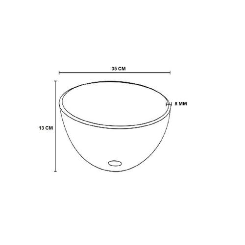 Altura : 13cm Comprimento : 35cm Profundidade : 35cm Espessura : 8mm Material : vidro temperado Modelo: apoio Furo saída de água : 4cm Formato : redonda