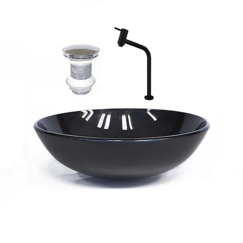 Cuba de vidro redonda 35cm preta + valvula + torneira preta as nossas cubas de vidro são ideais para projetos de decoração em banheiros com alto padrão e bom gosto, pois proporcionam um efeito moderno e único ao ambiente, são instaladas sobre a bancada e por isso realçam com destaque o acabamento do seu banheiro, sem contar a eficiência e praticidade que se leva para a sua casa. O vidro é pintados com tinta de alta performance, o que lhe garante a permanência da cor. Na compra deste super combo 3 em 1, você compra de uma só vez, a cuba redonda, válvula click e a torneira de metal preta, de forma mais fácil, mais rápido e mais barato. Dados técnicos da cuba: formato: redonda; material: vidro; instalação: apoio ou sobrepor; dimensões: 35x35x13cm comprimento x profundidade x altura ; espessura: 12mm. Dados técnicos da válvula: formato: redonda; material: polipropileno; instalação: cubas, tanques e lavatórios; diâmetro: 1. 1/4 polegadas. Dados técnicos da torneira preta: material: liga metálica preta; conexão de entrada: 1/2 polegada -1/4 volta; altura total da torneira: 37 cm; altura da queda dágua: 27 cm. Garantia de todos os itens: 12 meses conforme política de troca e devoluções . Montagem: montagem e instalação não inclusa na venda ou preço do produto, elas são de inteira responsabilidade do cliente. Atenção: preço referente a cuba, válvula click e torneira de metal preta. Imagens ilustrativas.