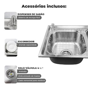 Design, Modernidade e ElegânciaA Cuba Dupla em Inox Gourmet é um dos itens mais importantes para estilizar a cozinha do seu jeito, com um design moderno e elegante, proporciona mais satisfação nas tarefas do dia a dia e devido ao seu tamanho te ajuda a economizar tempo na realização dos afazeres.A Cuba Dupla em inox gourmet é bonita, resistente e moderna, um item como esse agrega ao ambiente e evita problemas com uso repetitivo devido a resistência. Seu uso é prático e sem dificuldades, é só fazer a montagem e aproveitar de um produto de alta qualidade. Simplicidade, beleza e qualidade são os principais fatores para a escolha.A Cuba Dupla em Inox Gourmet é a melhor opção devido ao seu tamanho otimizado que permite a realização de diversas tarefas ao mesmo tempo, lavar, secar, enxaguar etc. A multifuncionalidade é seu trunfo.Com uma cuba dupla, uma pessoa poderia ter ajuda de outra na lavagem de louças, vegetais e legumes, trazendo maior velocidade nos afazeres diários e mais praticidade para a cozinha em geral.CaracterísticasFeita em material InoxAntirruído no fundoAceita a maioria dos acessórios de cozinha trituradores e ralos Acabamento Escovado e acetinadoMaior área para otimizar afazeres domésticosItens InclusosRalo de piaDosador de DetergenteEscorredorEspecificações da Cuba:Material: Inox 304Acabamento: Acetinado escovado circularComprimento: 77 cmLargura: 42 cmProfundidade: 20 cm