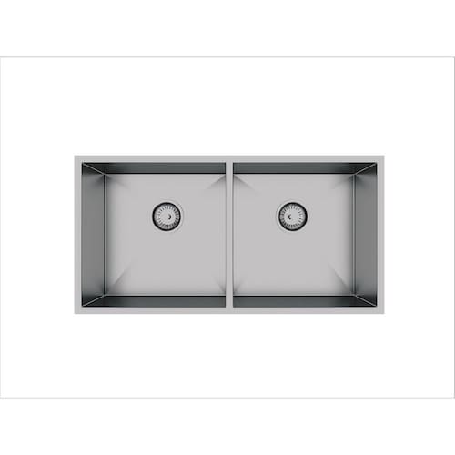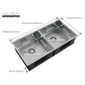 Material: Aço Inoxidável AISI 304 Espessura: 1 mm Acabamento: Escovado Instalação: Embutir Medidas externas: 860 x 440mm (Comp x Larg) Medidas internas: 400 x 400mm + 400 x 400 (Comp x Larg) Profundidade da cuba: 200mm Acompanha 2 válvulas de 4.1/2".