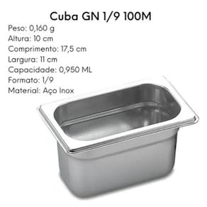 Cuba Gastronômica GN 1/9 - 17,6 x 10,8 x 10 cm REF_3249-10 As cubas em Aço Inoxidável AISI 201 foram desenvolvidas especialmente para utilização gastronômica, seja em Refrigeradores e Freezers, Rechauds, Buffet’s, Mesas Térmicas, Balcões Quentes ou Frios em restaurantes, bares, lanchonetes, cozinhas e refeitórios em geral.