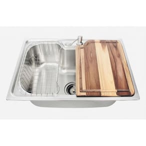 Acompanha válvula de 4 1/2 que possibilita a instalação de triturador de resíduos, escorredor de louça em aço inox e dispenser de detergente em aço inox e torneira monocomando gourmet 50 cm.