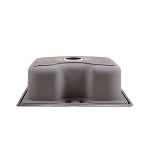 Acompanha válvula de 4 1/2 que possibilita a instalação de triturador de resíduos, escorredor de louça em aço inox e dispenser de detergente em aço inox e torneira monocomando gourmet 50 cm.