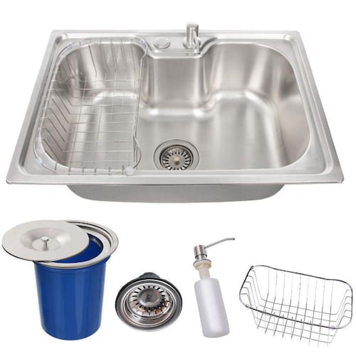 Itens inclusos: 1 Cuba Gourmet Aço Inox 201 1 Cesto escorredor 1 Dosador de detergente de 500ml 1 Válvula de escoamento. 1 Lixeira de Embutir Aço inox 304 8 Litros